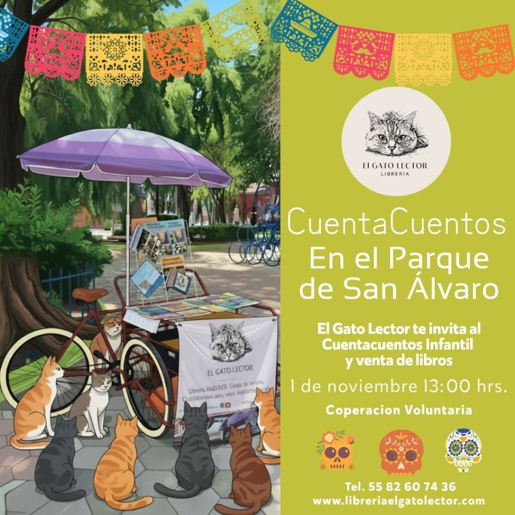 Este 1 de noviembre, a las 13:00 nos vemos en el Parque San Álvaro (Bocanegra esquina C. José Sánchez Trujillo s/n, Col. San Álvaro, Azcapotzalco, CDMX) para una aventura literaria llena de cuentos para nuestros mininos lectores.